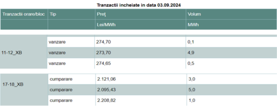 Pentru exemplificare prezentăm mai jos un exemplu pe date concrete din dată de 03.09.2024 (date oficiale extrase de pe site-ul OPCOM).